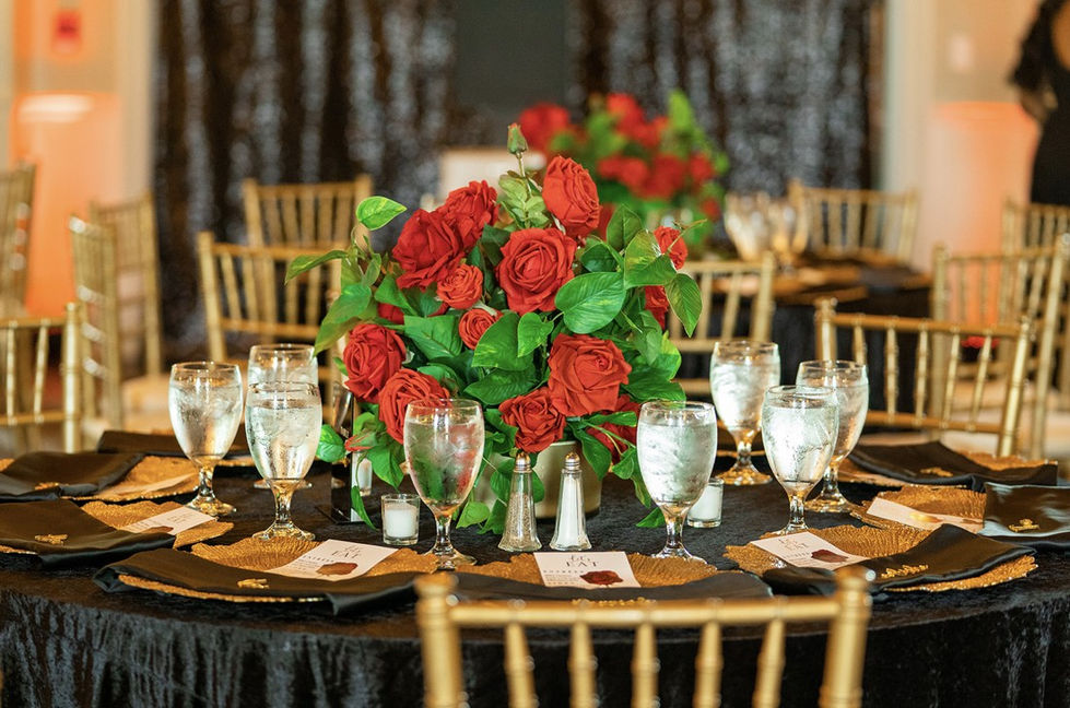 Elegant event decor with red rose arrangements, featuring table settings, floral centerpieces, and event entrances.